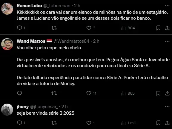 Com a ida de Dorival Júnior para a Seleção Brasileira, o São Paulo busca técnico no mercado da bola. Desta forma, perfis são-paulinos e internautas passam a comentar sobre possibilidades.