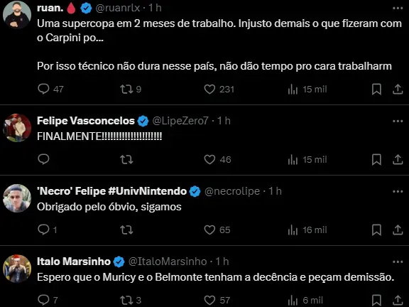Apesar de campeão da Supercopa com o São Paulo para quebrar o tabu que aflingia a torcida, o técnico Thiago Carpini foi eliminado no Campeonato Paulista, somou três pontos suados na Libertadores e não somou nenhum no Brasileirão.