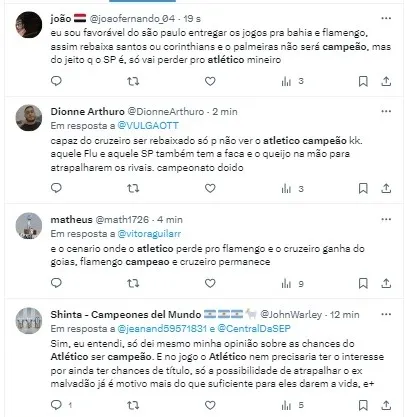 “O Galo está na briga pelo título também. Felipão. Não esqueçam que é Luiz Felipe Scolari. Lembrando que: manifestação na porta de CT, jogador pipoqueiro, jogador mercenário, e Felipão está lá. É líder do returno. Se o Atlético ganha do Flamengo vai para 63 pontos e ultrapassa no saldo”, apontou Leifert.