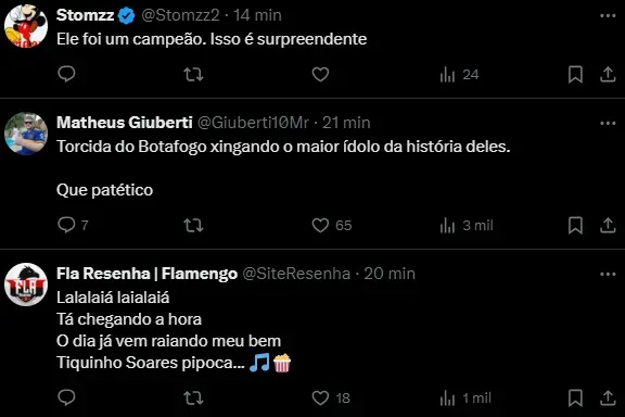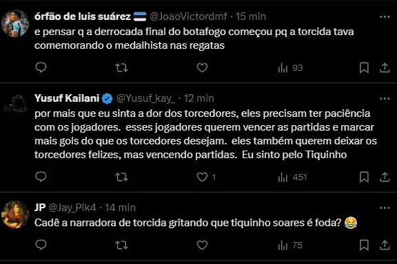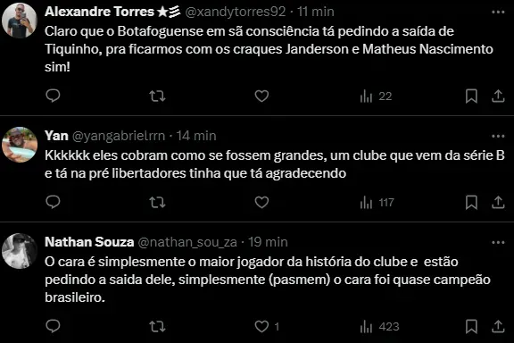Enquanto isso, parte da torcida aproveita para disparar na direção de jogadores que estão deixando a desejar: “Tiquinho, pipoqueiro FDP”, “sai do Botafogo, viad*” e outras frases aparecem hoje.
