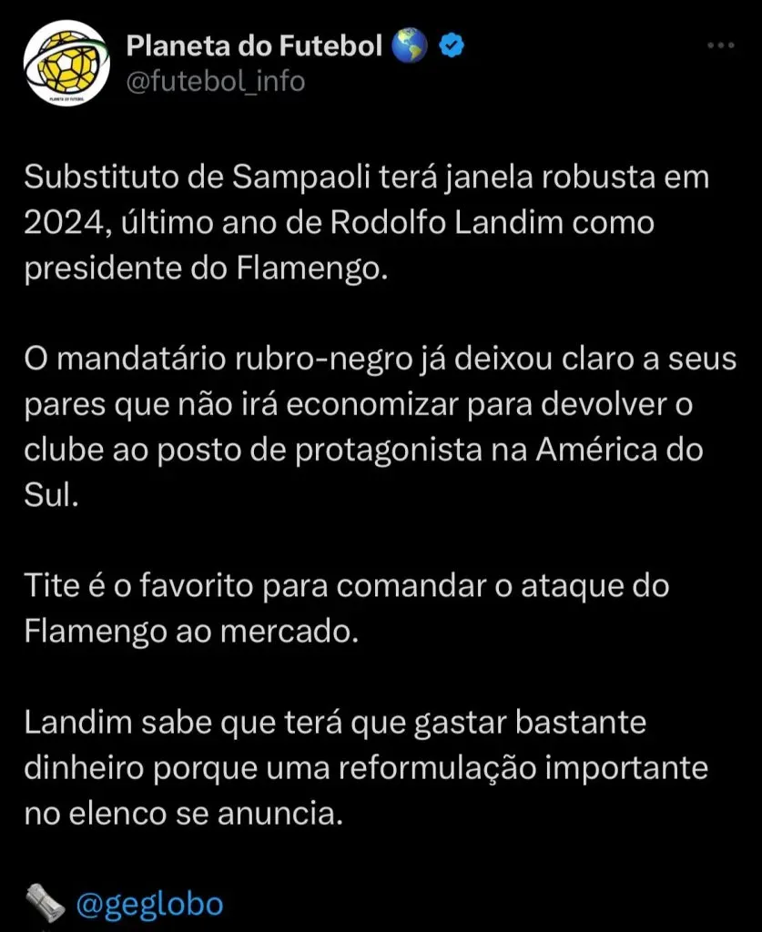 Tite deve assumir em breve o comando da equipe flamenguista, e o presidente Rodolfo Landim já tem planos para a passagem do treinador em 2024.
