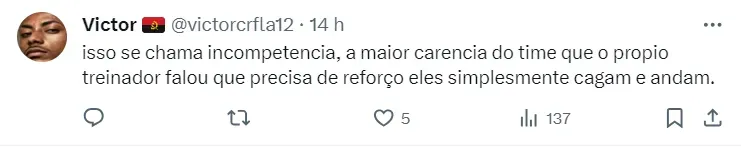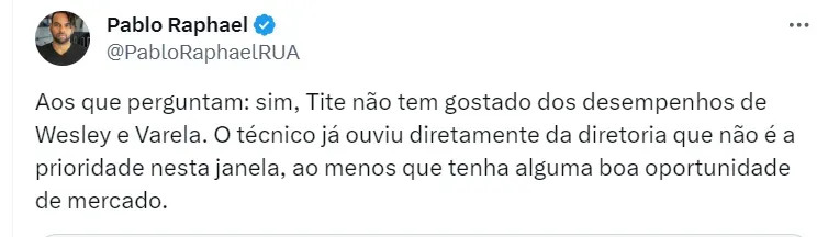 A informação de Pablo Raphael é de que Tite não está contente com os desempenhos de Varela e Wesley neste começo de temporada pelo clube carioca. A diretoria está ciente do descontentamento de Tite, mas não irá em busca de reforços.