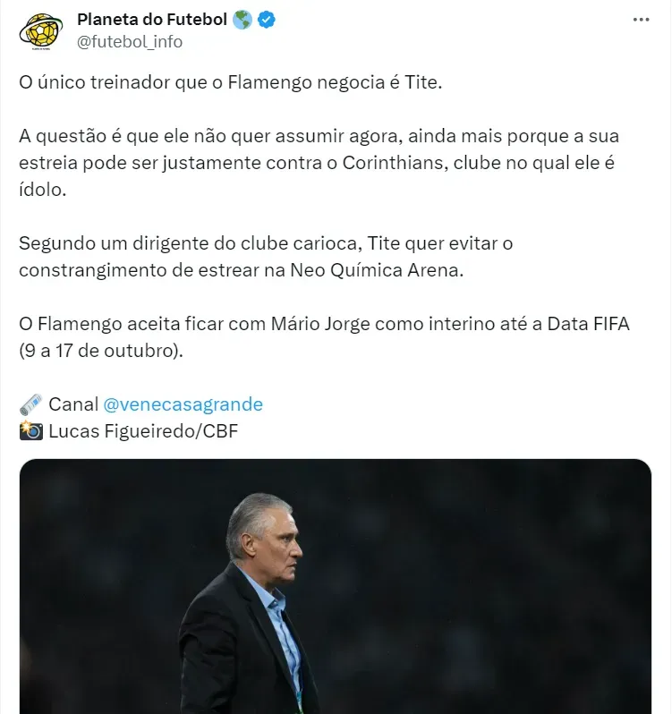 O Flamengo parece compreender a situação de Tite e está disposto a manter Mário Jorge como interino até a data FIFA. No entanto, a torcida do Flamengo não parece estar completamente satisfeita com a decisão do treinador em adiar sua estreia, dado o pedido de evitar enfrentar o Corinthians.
