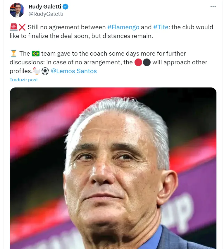 Segundo Rudy Galetti, Tite conversa com o clube carioca, mas um acordo ainda está distante. A fonte conta que a diretoria deu a Tite alguns dias para pensar sobre, mas, caso não haja acordo, irá em busca de novos nomes.