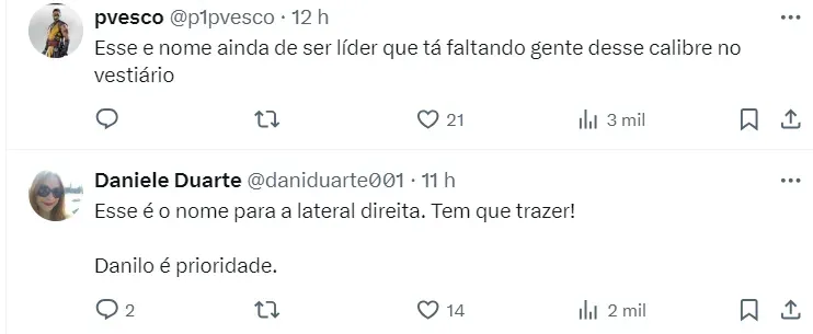 O nome solicitado, de forma urgente, é Danilo, da Juventus, que tem contrato com a Velha Senhora até julho de 2025, mas pode fazer parte de uma barca de saídas do time italiano no final da temporada.