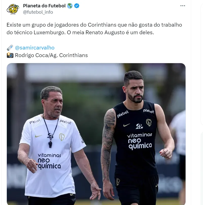 O meia Renato Augusto, de 35 anos de idade e que está em fim de contrato, é um jogador do Corinthians que se manifestou contra o trabalho de Luxemburgo à frente da equipe. De acordo com Samir Carvalho, há um grupo de atletas que não está satisfeito com o trabalho do atual técnico, e Renato Augusto seria um dos integrantes desse grupo.