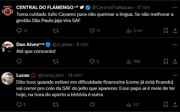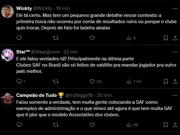 Ele vai além, mas com cautela: “Não digo que sou um defensor desse sistema e descarto a SAF, não, mas o São Paulo tem que observar isso com tranquilidade”, acrescentou.