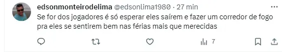 “Só queria entender qual o motivo da festa que está tendo dentro do CT?! Guerra, clima ruim na cidade e os caras estão fazendo ‘festinha’. Não dá para entender. Só queria saber qual é o motivo da festa”, disse no vídeo.