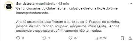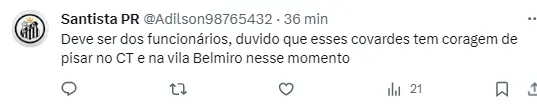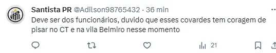 Na última quinta-feira (7), torcedores organizados invadiram a Vila Belmiro atrás do presidente Andres Rueda, que não estava no local e ainda não deu sinais de que vai aparecer tanto no estádio como no CT Rei Pelé, segundo o UOL. Ele ainda não efetuou pagamento de salários no Santos.