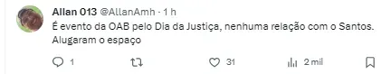Porém, a informação logo em seguida veio à tona. O churrasco no CT Rei Pelé não tem relação como Santos, e sim, um evento da OAB pelo “Dia da Justiça“, que alugou o local, como publicou o jornalista Lucas Costa que cobre o dia do clube, após um torcedor fazer o comentário sobre.