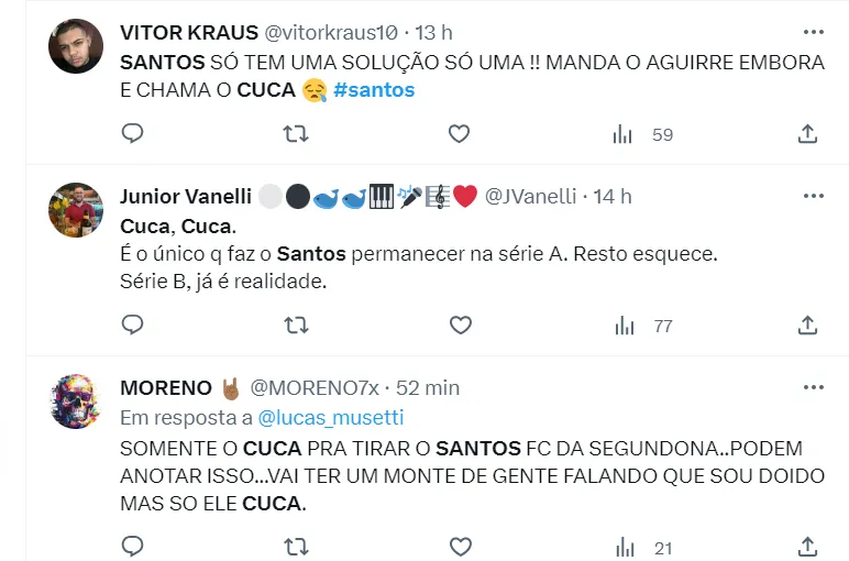 Torcedores do Santos estão nas redes sociais pedindo para que a diretoria contrate Cuca de volta. O Peixe passa por uma situação desesperadora no Brasileirão de 2023, com chances reais de cair para a Série B na próxima temporada.