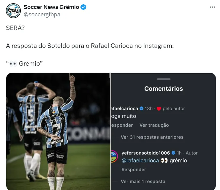 Soteldo e Rafael Carioca interagiram no Instagram após atuação do venezuelano na Libertadores. O volante do Tigres comentou que o atacante jogava muito, que respondeu o convidando para o Grêmio com uma indireta.