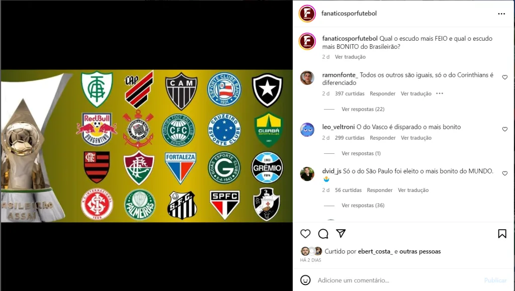 Torcedores elegeram os 10 escudos mais bonitos do futebol brasileiro em uma postagem da página “Fanáticos por futebol”, no Instagram. O Botafogo, atual líder do Brasileirão, foi um dos citados na postagem. O Vasco também foi bastante mencionado pelos torcedores.