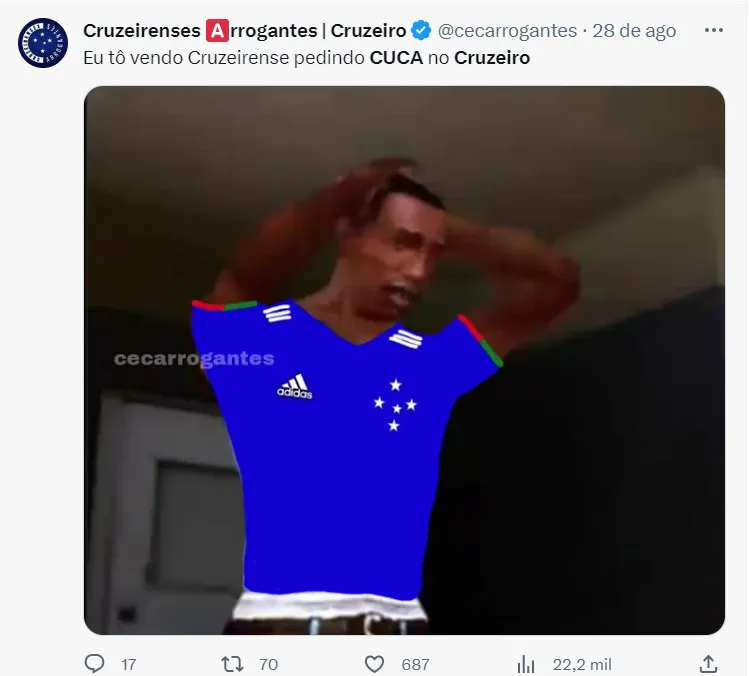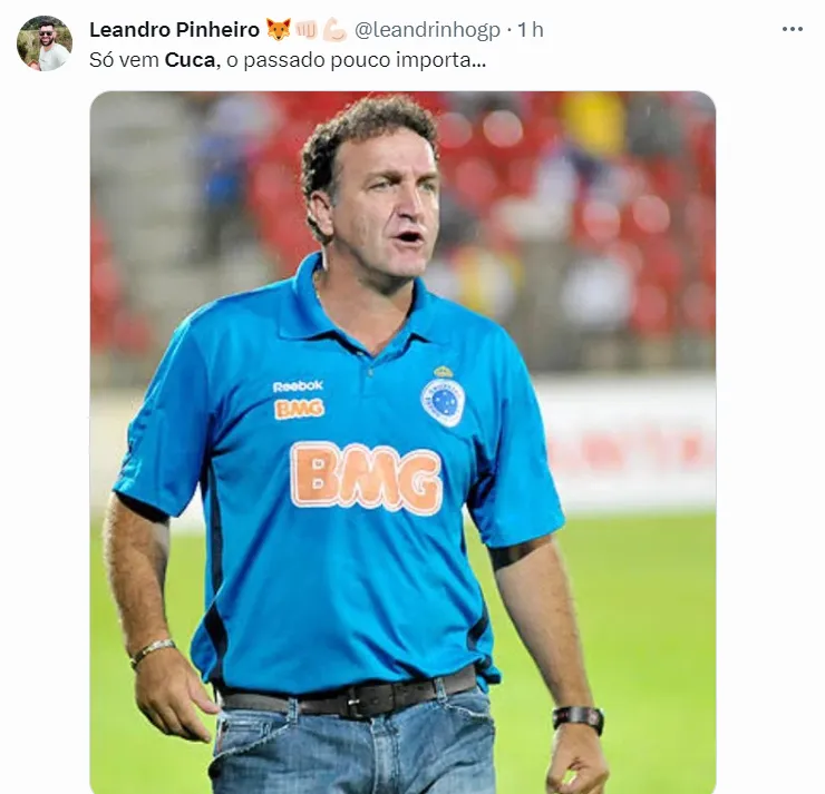 Nas redes sociais, parte da torcida do Cruzeiro é a favor da chegada de Cuca à Raposa. Pepa caiu do comando e, agora, o clube precisará buscar um novo nome. Apesar de ser ídolo do rival Atlético, a torcida mineira é a favor da possível vinda de Cuca a BH.