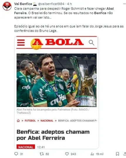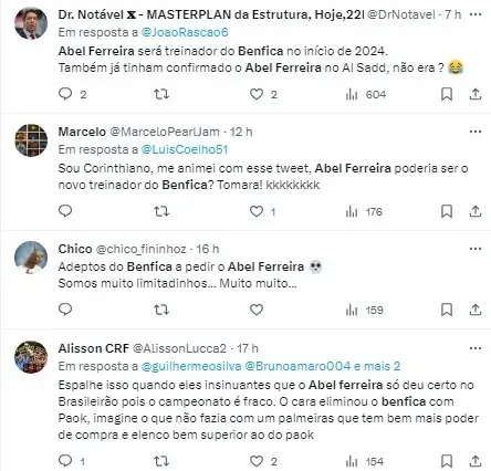 Comentários como “Vem, Abel”, “Abel Ferreira urgente” e “Abel Ferreira em janeiro” inundaram as redes sociais do Benfica, refletindo a insatisfação de parte da torcida após o tropeço da última sexta-feira (8).
