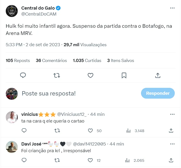 Na web, torcedores do clube mineiro não gostaram nada da atitude de Hulk, uma vez que o próximo jogo é de enorme importância para o Galo, que, se perder, pode se distanciar ainda mais da zona de classificação para a Libertadores..