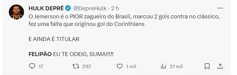 Na web, comentários como “fora, Felipão”, “esse time tem a cara do Felipão” e “Felipão, eu te odeio“, estão entre os torcedores do Galo, que temem pelo pior em 2024.