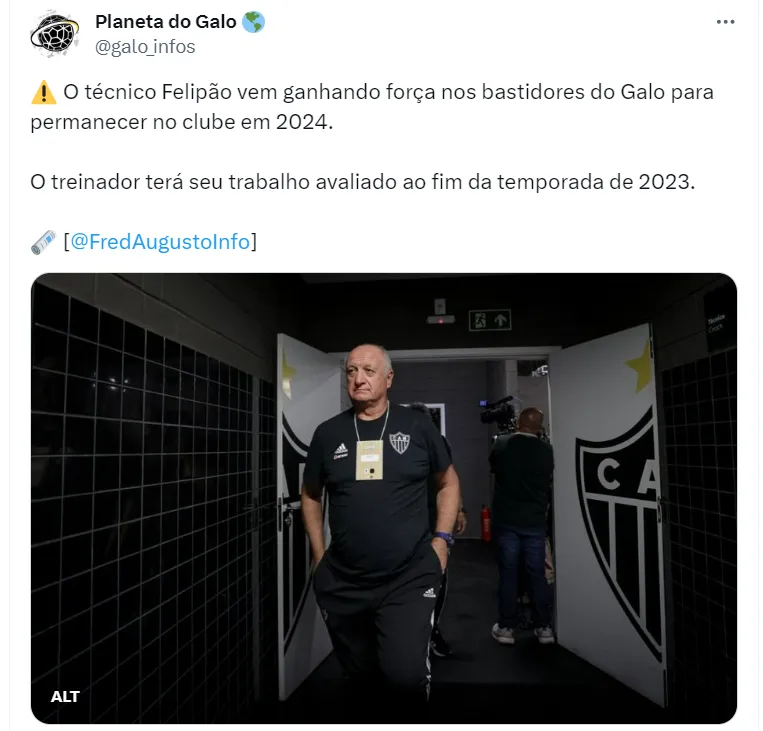 De acordo com Fred Augusto, Felipão vem ganhando força para seguir no comando do Atlético MG para 2024. A fonte informa que o trabalho de Felipão será avaliado ao final da temporada de 2023.