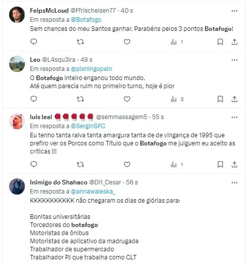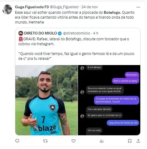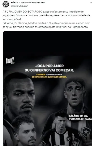“A Fúria Jovem do Botafogo exige o afastamento imediato de jogadores frouxos e omissos que não representam a nossa vontade de ser campeões! Eduardo, Di Plácido, Marlon Freitas e Cuesta compõem um elenco sem sangue, trazendo enorme frustração nesta reta final do Campeonato”, postou a torcida em suas redes sociais.