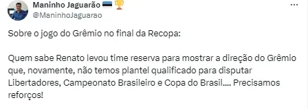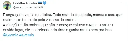 “Desde domingo o Grêmio só decepcionou. Perdeu Gre-Nal com cagadas individuais. Não valorizou a Recopa e menosprezou o São Luiz. Levou reservas que nem atenderam os torcedores e jogaram com a preguiça de uma segunda às 5h. Renato não viajou e treinou por home office”;