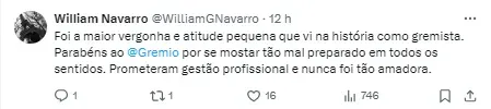 “Foi a maior vergonha e atitude pequena que vi na história como gremista. Parabéns ao Grêmio por se mostrar tão mal preparado em todos os sentidos. Prometeram gestão profissional e nunca foi tão amadora”;