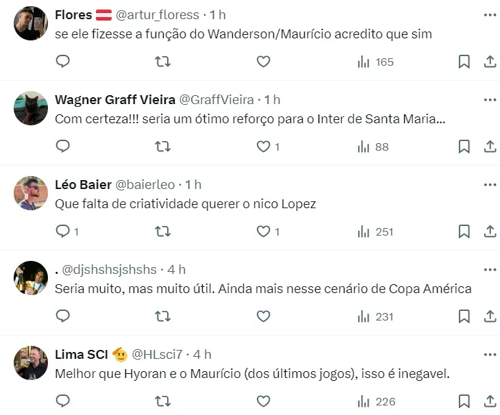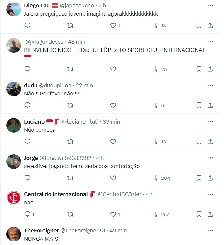 “Que falta de criatividade querer o Nico López”, disse um torcedor. “Se for para contratar esse preguiçoso, contrata o Cervi, que é muito melhor”, diz outro torcedor colorado.