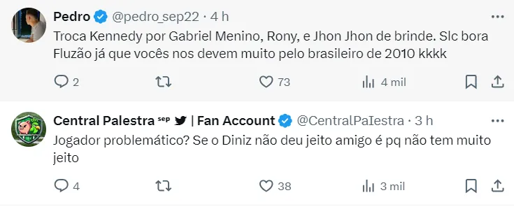 “Troca Kennedy por Gabriel Menino, Rony e John John de brinde. Bora, Fluzão, já que vocês nos devem pelo Brasileirão de 2010”, brinca um torcedor do clube paulista.