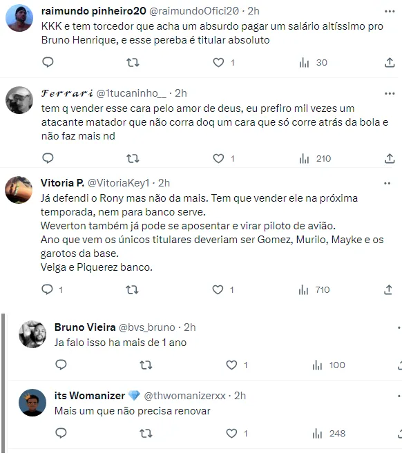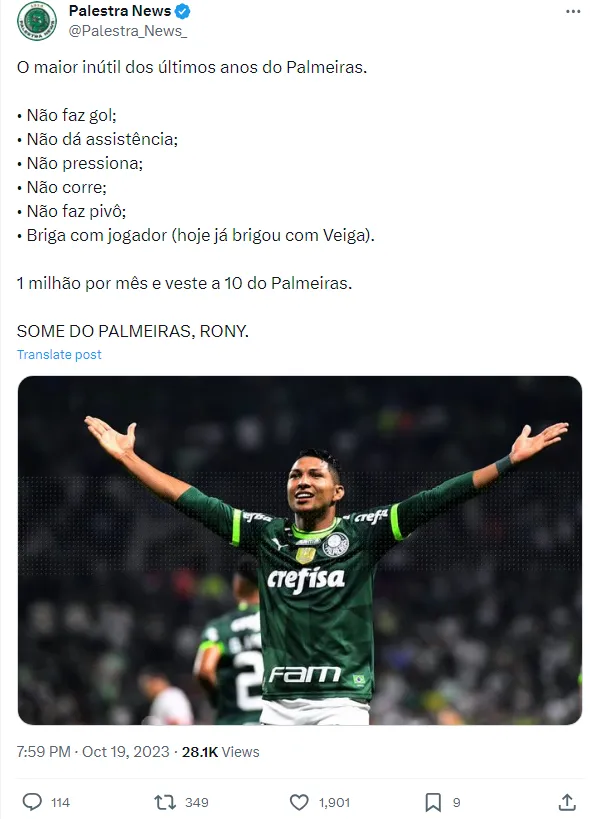 Dessa forma, a torcida do Palmeiras expressou sua frustração com os titulares, especialmente com o camisa 10, Rony, que tem enfrentado um período de escassez de gols, e perdendo muitas oportunidades durantes os últimos jogos.