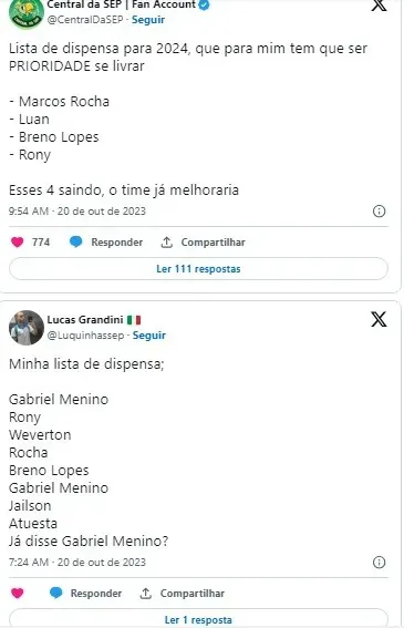 A sequência de maus resultados tem deixado muitos torcedores inconformados, levando a uma onda de críticas nas redes sociais. Muitos deles elaboraram suas próprias listas de dispensas para o elenco do Verdão na temporada de 2024.