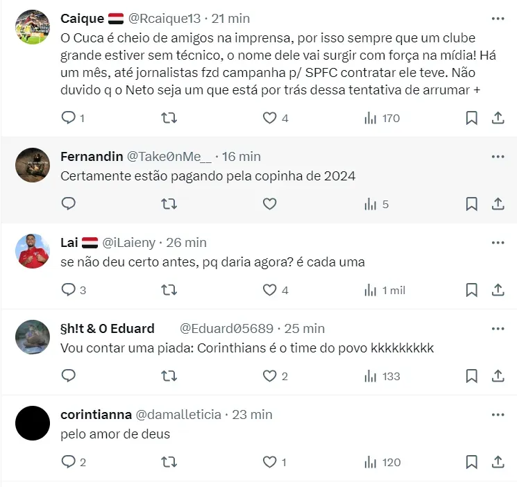 Outros nomes vêm sendo ligados ao Corinthians de Augusto Melo. O presidente do Timão terá uma reunião em breve com as Organizadas para tratar do assunto e, assim, tentar chegar a um acordo com um novo treinador. Veja alguns comentários abaixo.