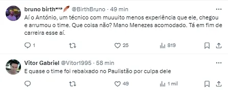 Diante desse cenário, a torcida ainda externou a revolta com o desempenho que o time teve na reta final do Campeonato Brasileiro e no Campeonato Paulista sob o comando de Mano (SIC).