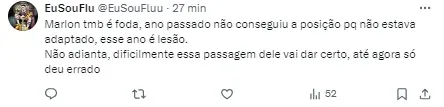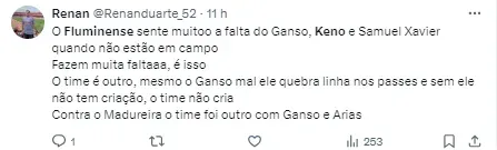 “O Marlon preocupa um pouco mais por ter tido uma dor forte no joelho. O Keno não preocupa nada. Foi um daqueles que a gente poupou. Metade dos titulares. Ele já sentiu os efeitos da altitude no jogo e achamos que era interessante poupá-lo”, começou o técnico Diniz, do Fluminense.
