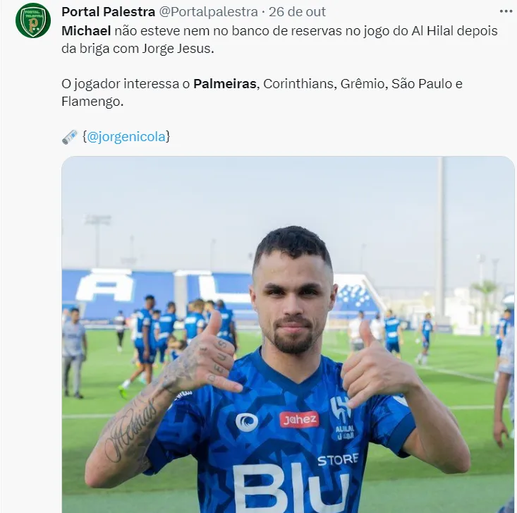 O contrato de Michael com o Al Hilal vai até o ano de 2025. Com a lesão de Neymar, as chances de o clube saudita negociá-lo são baixas. Jorge Jesus conta com seu futebol.
