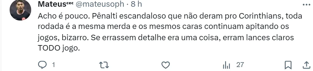 Mas o duelo ficou marcado por outra situação que chamou a atenção. A não marcação de pênalti a favor do Corinthians gerou uma revolta nos dirigentes. Na súmula, o árbitro relatou xingamentos do gerente de futebol Alessandro Nunes e Duilio Monteiro, presidente do clube.