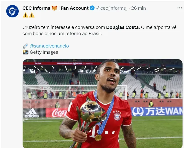 De acordo com informações de Samuel Venâncio, o Cruzeiro está de olho no futebol de Douglas Costa e tem interesse em contar com o futebol do atacante em 2024.