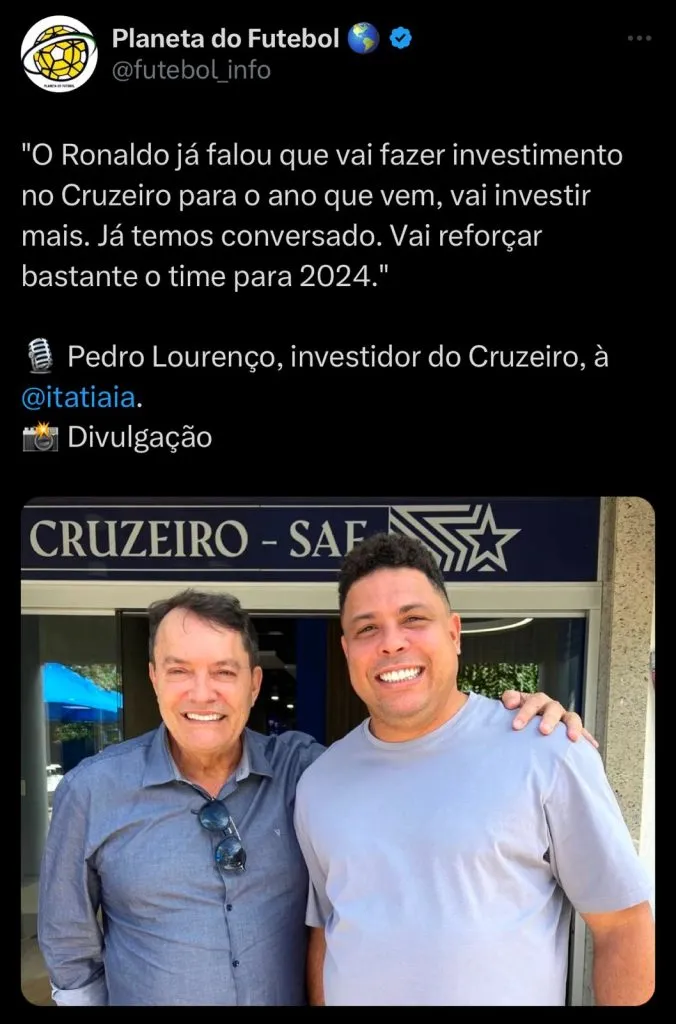 “O Ronaldo já falou que vai fazer investimento no Cruzeiro para o ano que vem, vai investir mais. Já temos conversado. Vai reforçar bastante o time para 2024.” afirmou Pedro Lourenço para a Itatiaia.