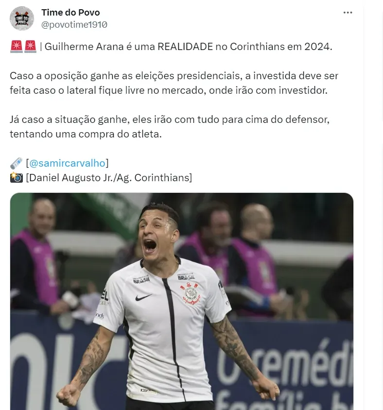 No Corinthians, Guilherme Arana é uma possibilidade real. O clube planeja ir ao mercado em 2024 e pode até buscar um investidor para realizar grandes contratações.