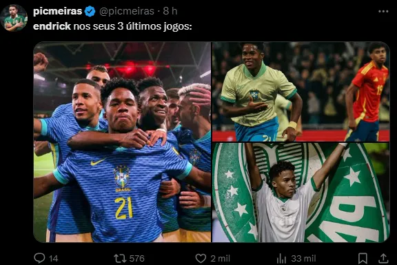 Três gols em cinco dias. Endrick marcou contra Inglaterra, Espanha e agora Novorizontino, com foto que está rodando o mundo da bola por conta da comemoração.