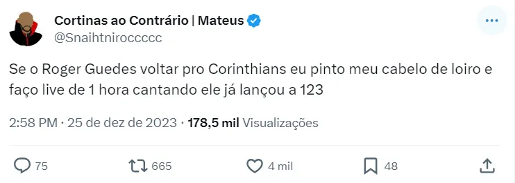 Não demorou muito para a Fiel ficar maluca nas redes sociais em uma possível volta de Roger Guedes para o clube em 2024. Todavia, por ora, não há informações qualquer sobre algum tipo de conversa ou sequer interesse clube.