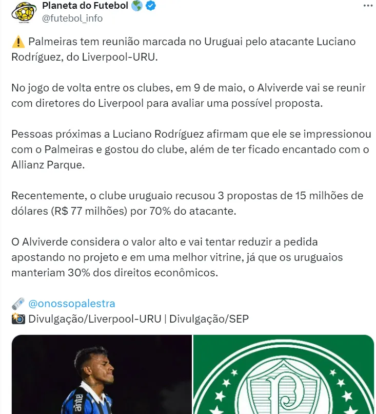 Com influência de Valverde, o Real Madrid entrou em cena pela contratação do atacante Luciano Rodríguez, de 20 anos de idade, do Liverpool-URU, forte alvo do Palmeiras no mercado da bola.