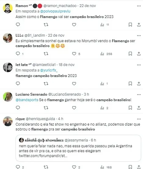 “O jogo de hoje é o mais difícil para o Flamengo. Se vencer, é favorito ao título. É o Tite agora. O Palmeiras não vai ganhar do Fortaleza e nem do Cruzeiro. Não ganha, estes dois jogos não vai ganhar. Se o Flamengo ganhar hoje, é favorito ao título”, afirmou Vampeta.