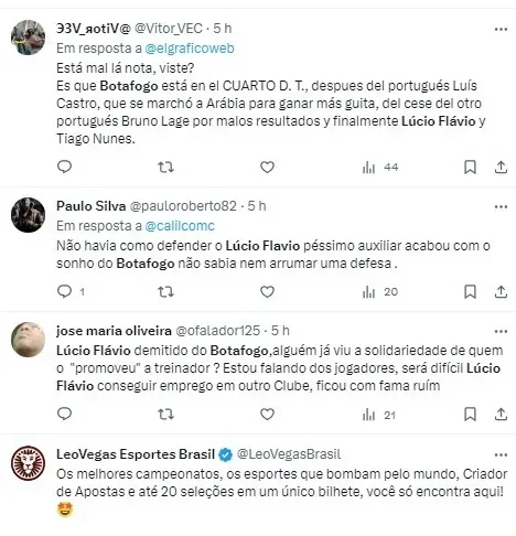 “Fez todos os cursos na CBF, como o Marcão, do Fluminense, fez. Ele assume como interino e depois volta a ser auxiliar. O Lucio Flávio era funcionário do Botafogo, os jogadores se reuniram para colocá-lo. Se o Tiquinho Soares faz o gol de pênalti contra o Palmeiras, o cara estava empregado”, completou.