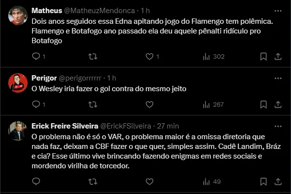 “Uma mão encosta, essas duas mãos são de referência. Para mim, é sem impacto. Edina (Alves), mão sem impacto, não tem flexão de cotovelo”, disse o VAR Caio Max, na cabine da partida.