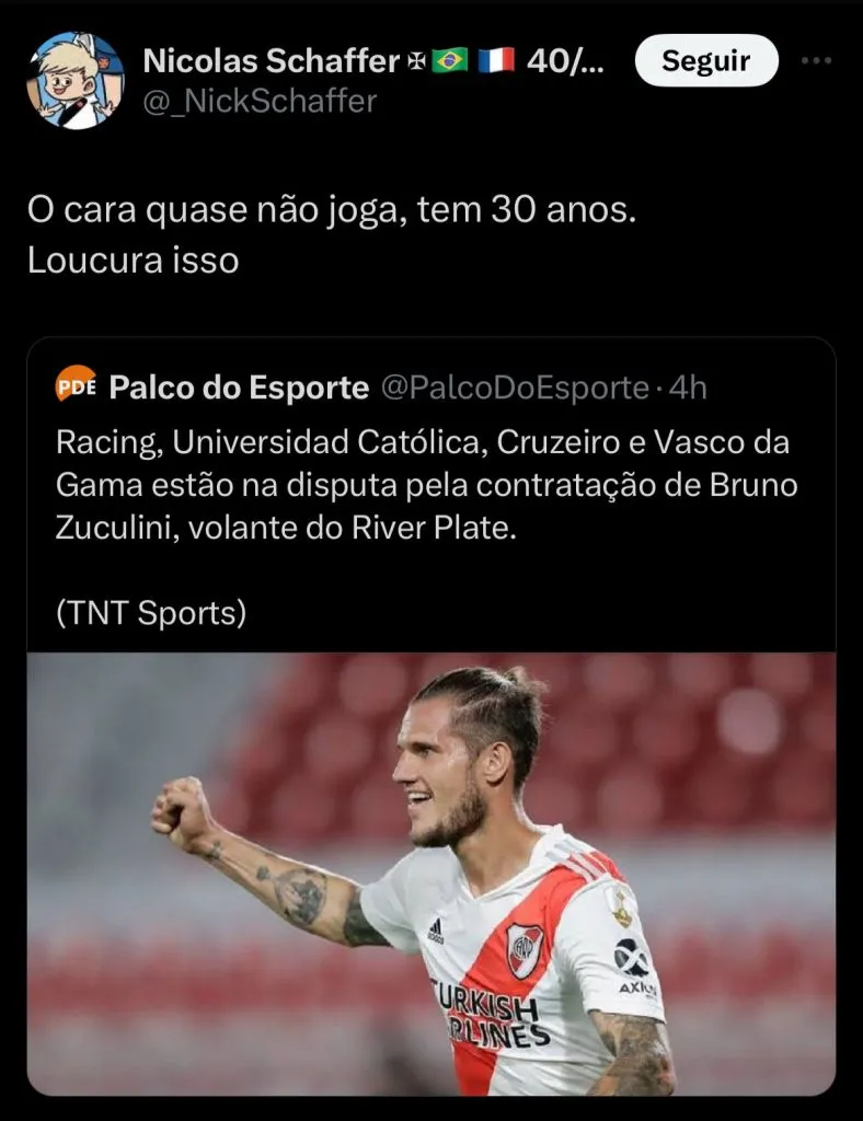 Segundo informações do portal TNT Sports Argentina, o meio-campista Bruno Zuculini, atualmente no River Plate, é um dos alvos do Vasco para a próxima temporada.