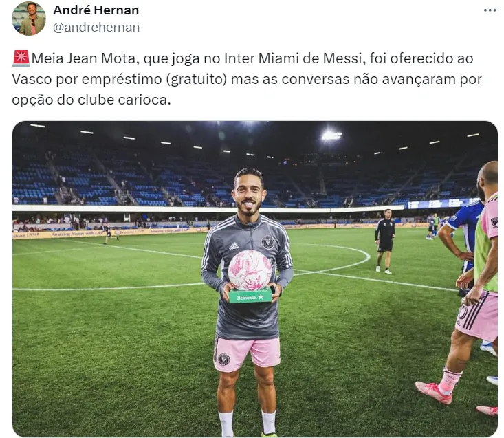Enquanto procura por um novo centroavante, o brasileiro Jean Mota se ofereceu para jogar no Vasco da Gama de graça. O ex-Santos é parceiro de Messi nos Estados Unidos.