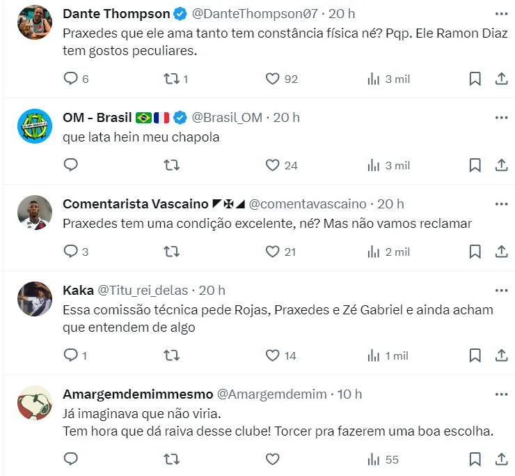 O nome do meia Praxedes foi comentado por alguns torcedores vascaínos que estão revoltados na web, que fizeram comparação envolvendo o nome de Igor. “Praxedes tem uma condição excelente, né? Mas não vamos reclamar”, disse um torcedor.
