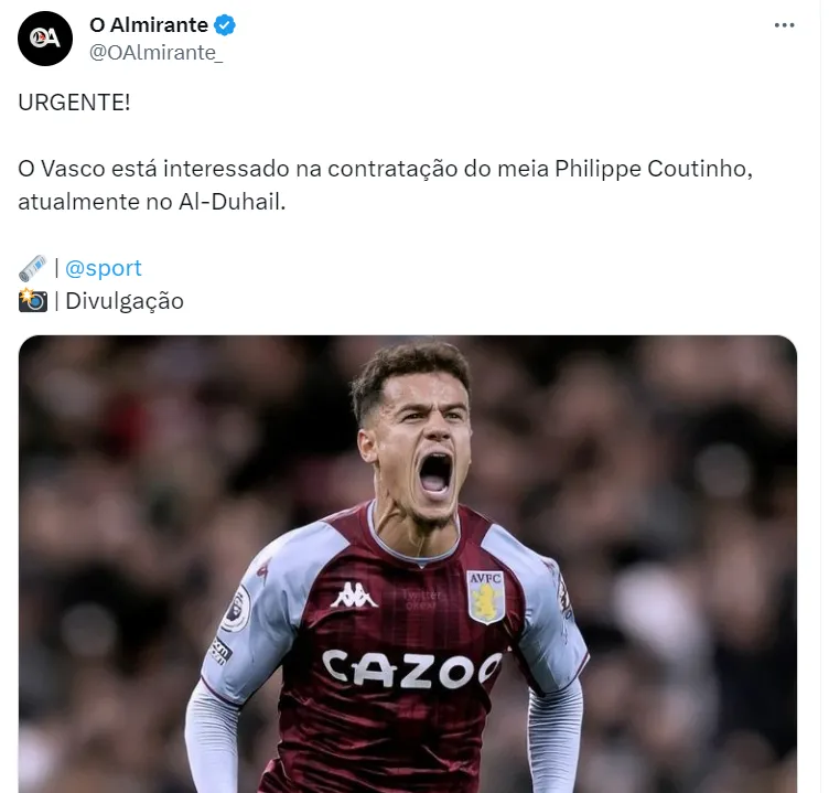 Coutinho pertence ao Aston Villa, da Inglaterra, e está emprestado, atualmente, a um clube do Catar, em um contrato que vai até o final da atual temporada da Europa, ou seja, até julho.