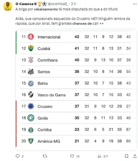 O Santos, que empatou em 0 a 0 com o Cuiabá, também viu suas chances de queda aumentarem, passando de 14,8% para 21,4%. Enquanto isso, o Corinthians, mesmo com uma derrota para o Red Bull Bragantino por 1 a 0, mantém um risco relativamente baixo de rebaixamento, com 8,9%.