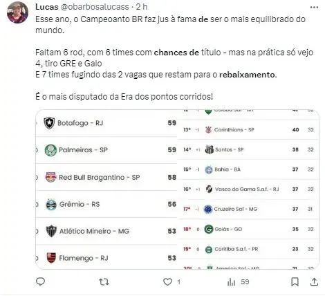 Além disso, Coritiba (19°) e Goiás (18°) enfrentam riscos consideráveis de rebaixamento, com 99% e 69,1% de probabilidade, respectivamente.