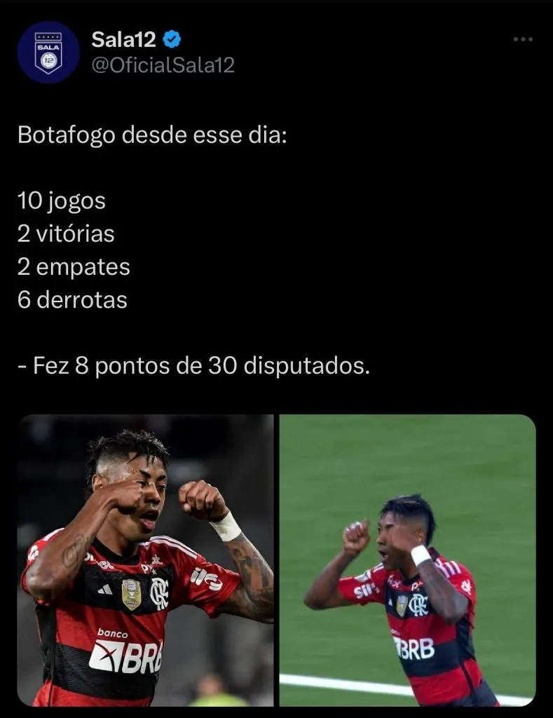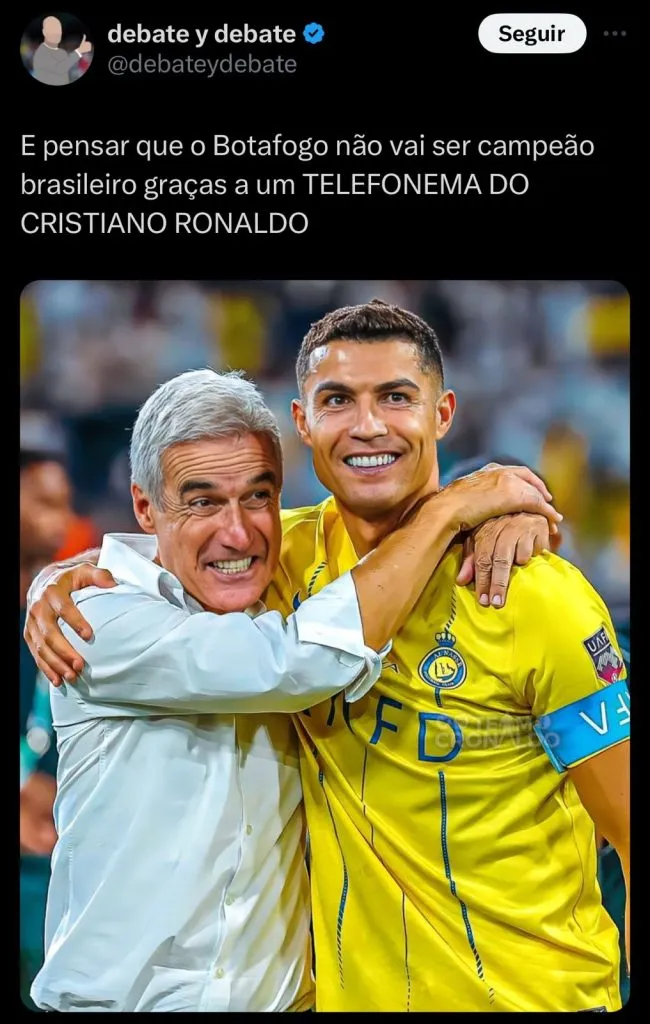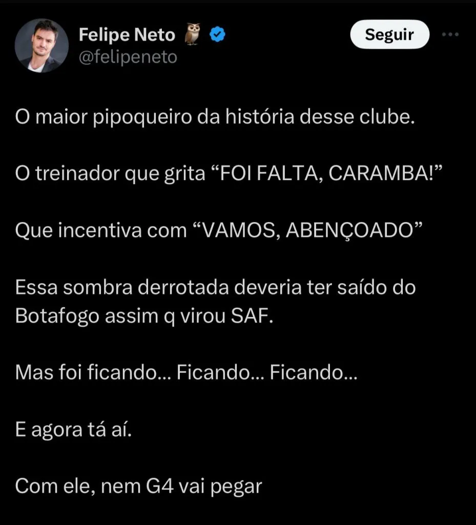 “O maior pipoqueiro da história desse clube. O treinador que grita “FOI FALTA, CARAMBA!”. Que incentiva com “VAMOS, ABENÇOADO”. Essa sombra derrotada deveria ter saído do Botafogo assim q virou SAF. Mas foi ficando… Ficando… Ficando… E agora tá aí. Com ele, nem G4 vai pegar.” afirmou Felipe Neto.